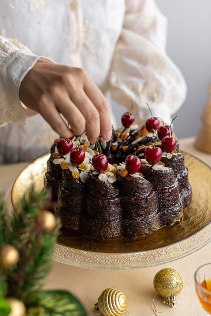 O bolo natalino com frutas e especiarias é daquelas receitas que aquecem mais do que o forno. Aquecem a memória. Macio, úmido e intensamente aromático, ele nasce carregado de frutas embebidas em conhaque, recebe o brilho delicado de uma calda de laranja e se veste de festa com amêndoas laminadas e cerejas frescas.